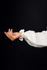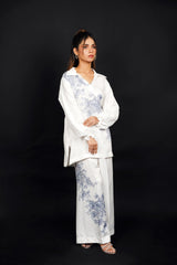 A sleek, all-white cord-set that combines effortless elegance with a minimalist vibe. The fabric is soft and slightly structured, ensuring a polished look while maintaining comfort. The shirt, with a relaxed fit tailoring, features a delicate light and deep blue floral pattern that flows gracefully across the fabric. The florals are subtle yet striking, arranged in a scattered design that brings a touch of nature’s beauty without overwhelming the overall simplicity. The soft light blue petals are accentuated by deeper blue accents, creating a balanced contrast that feels both fresh and refined.