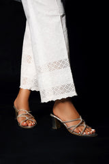 A white cotton bottoms adorned with beautiful, intricate embroidery flows gracefully across the entire fabric. Featuring a zig-zag pattern created with fine schiffli embroidery, it adds a lacy, openwork effect that perfectly complements the denser embroidery throughout. This piece boasts a unique, high-end look that is both stylish and sophisticated.