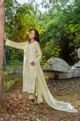 The extravagant chiffon dupatta adds an extra layer of sophistication. This is adorned with a beautifully embroidered border, intricately designed to mirror the Schiffli work on the ensemble. Scattered across the dupatta are small, elegant Schiffli motifs, adding a touch of whims and charm. This combination of the exquisitely embroidered green shirt and the luxurious dupatta creates a look that is both timeless and captivating, perfect for making a memorable impression of your fabulous personality.