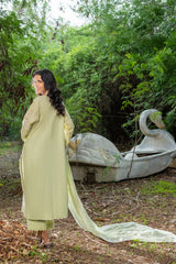 A stunning 3pcs green luxurious air-jet lawn ensemble, paired with a chiffon dupatta and air-jet trousers, tailored to perfection. This features exquisite Schiffli embroidery, which covers the fabric in delicate, lace-like patterns. The green hue of the ensemble enhances the intricate details of the embroidery, making them pop against the rich backdrop. This Schiffli work, with its precise and elegant designs, adds a refined and graceful touch to the ensemble, making it perfect for both day and evening wear.