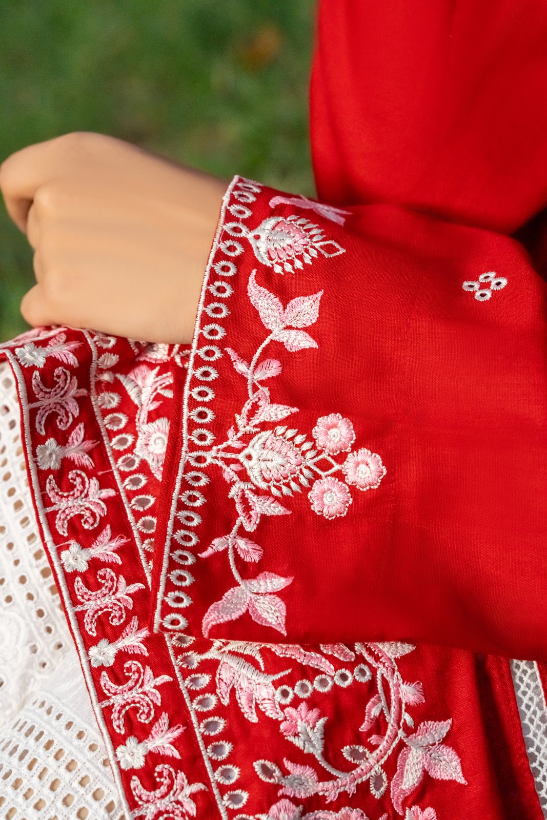 A ready-to-wear shirt  in a vibrant, beautiful red color that instantly catches the eye. The fabric is soft and comfortable, designed to drape elegantly on the body while offering ease of movement, during all seasons. The shirt is adorned with intricate Schiffli embroidery in delicate white and light pink threads.