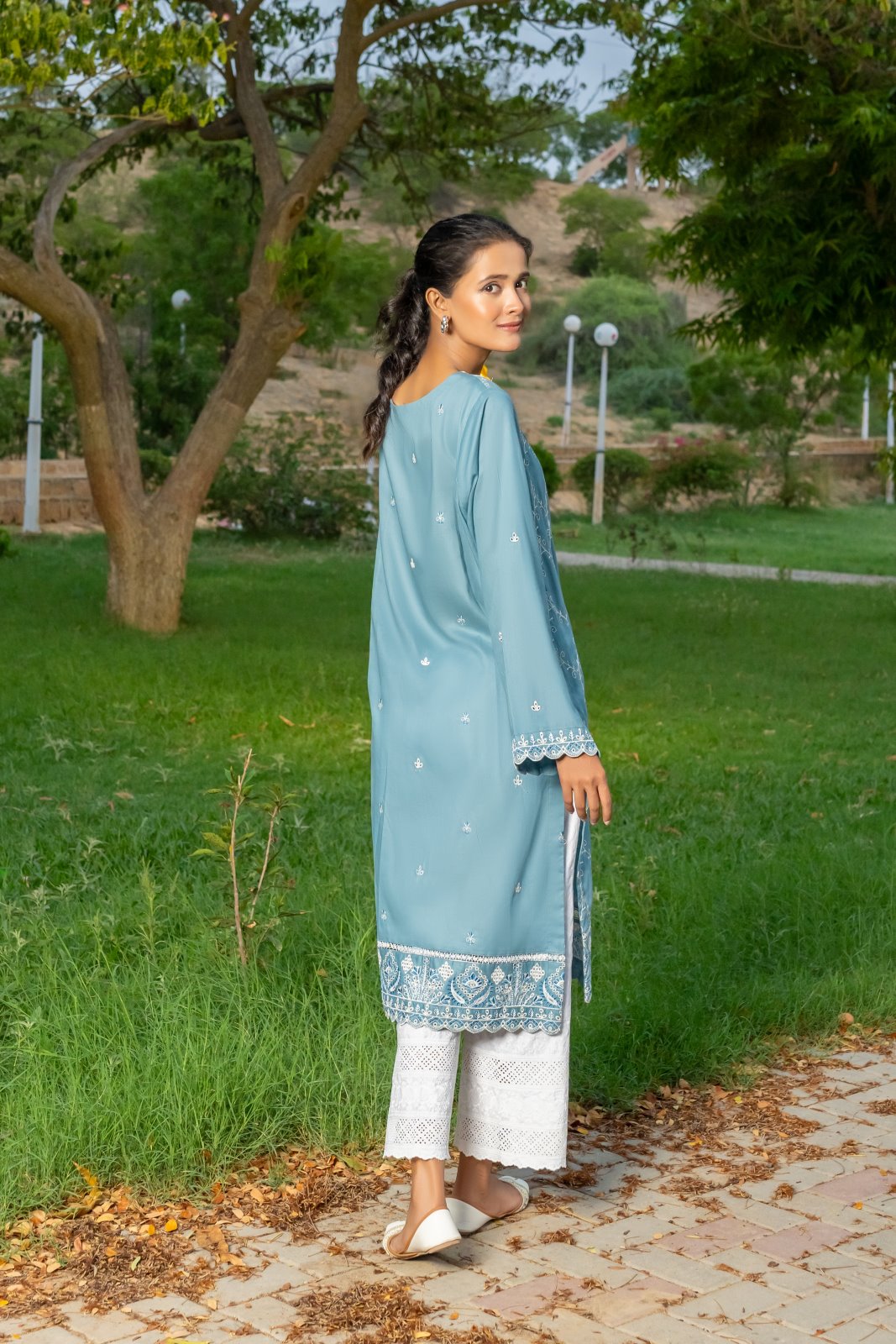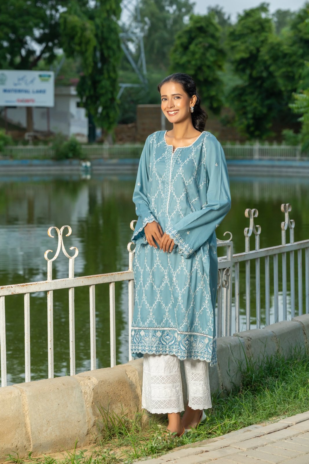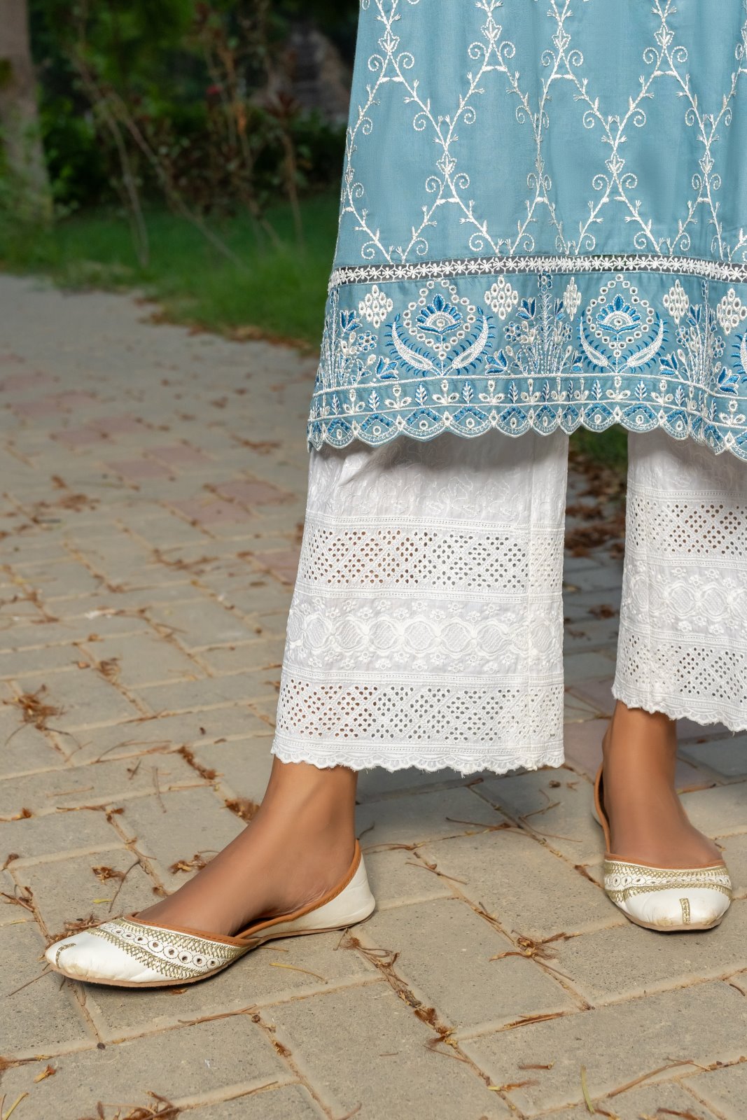The shirt is adorned with intricate Schiffli embroidery in white and deep Wedgewood blue. The deep Wedgewood Schiffli work, in a slightly darker shade of blue, adds depth and sophistication to the design, blending harmoniously with the base color while still offering a subtle contrast.