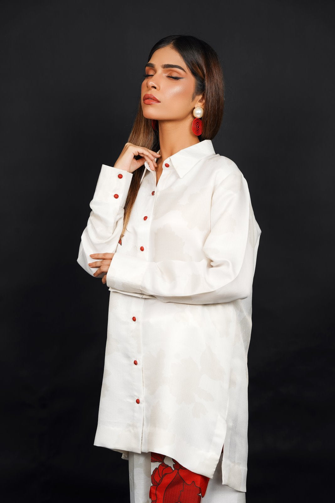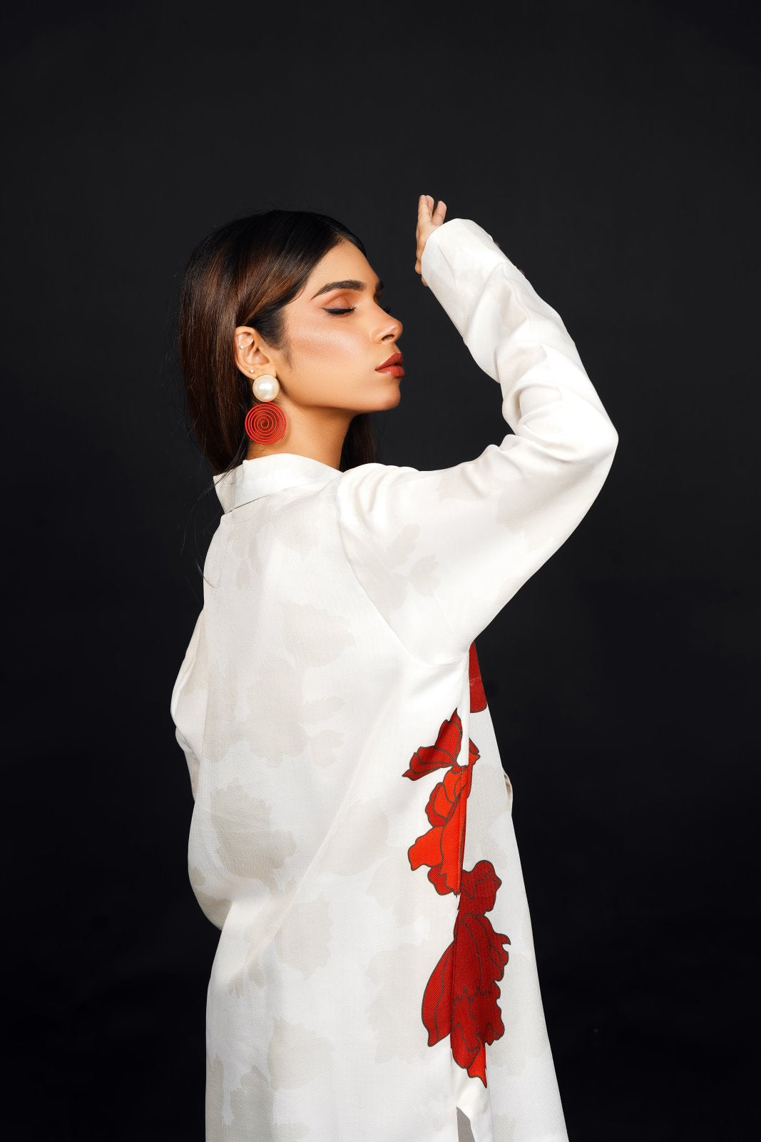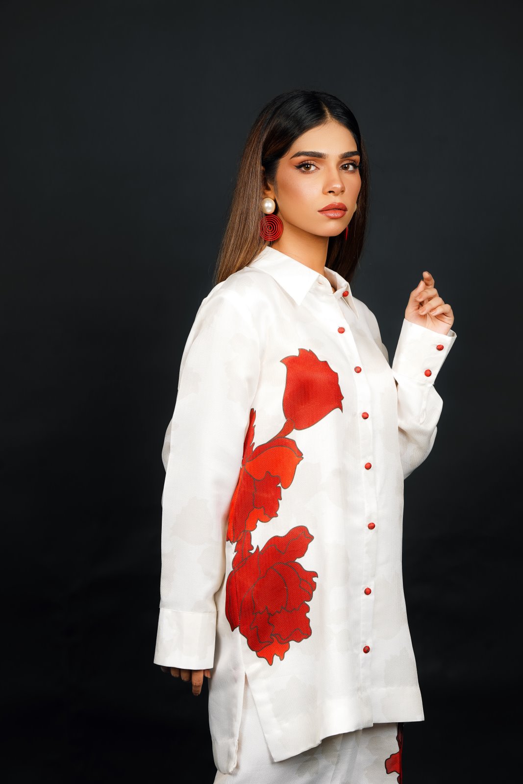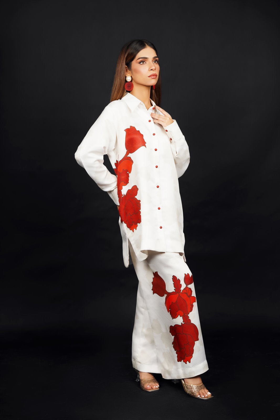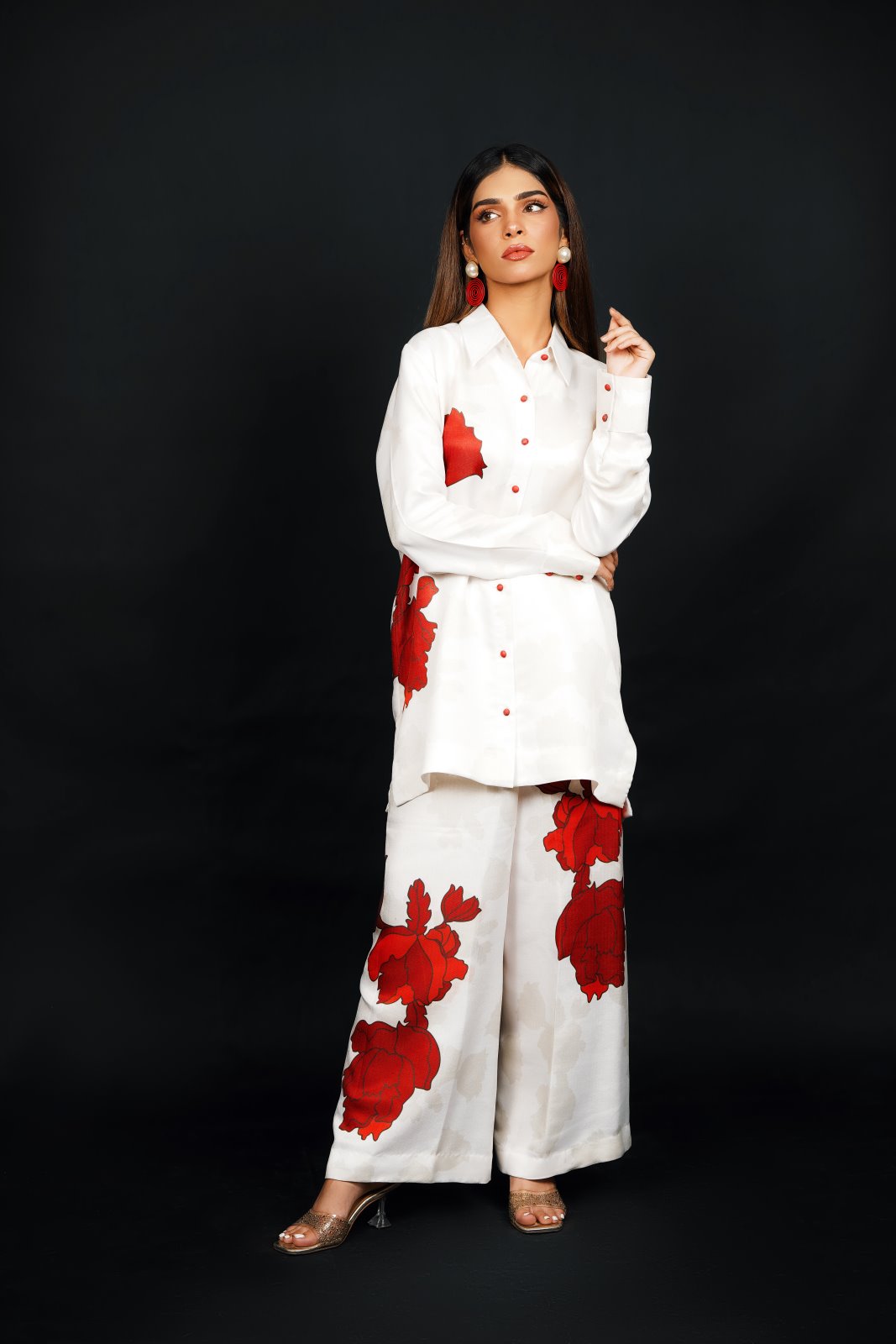 A stunning all-white cord-set that exudes sophistication with a bold yet artistic touch. The shirt, made from soft, flowy fabric, has a relaxed fit that drapes elegantly on the body. What sets it apart is the striking Big Red Floral pattern that cascades down one side of the shirt, creating a dramatic focal point. The vivid red flowers, large and eye-catching, are detailed with beautiful petals. These bold florals seem to bloom across the fabric, extending their beauty along the side, adding an artistic flair to the minimalist white background.