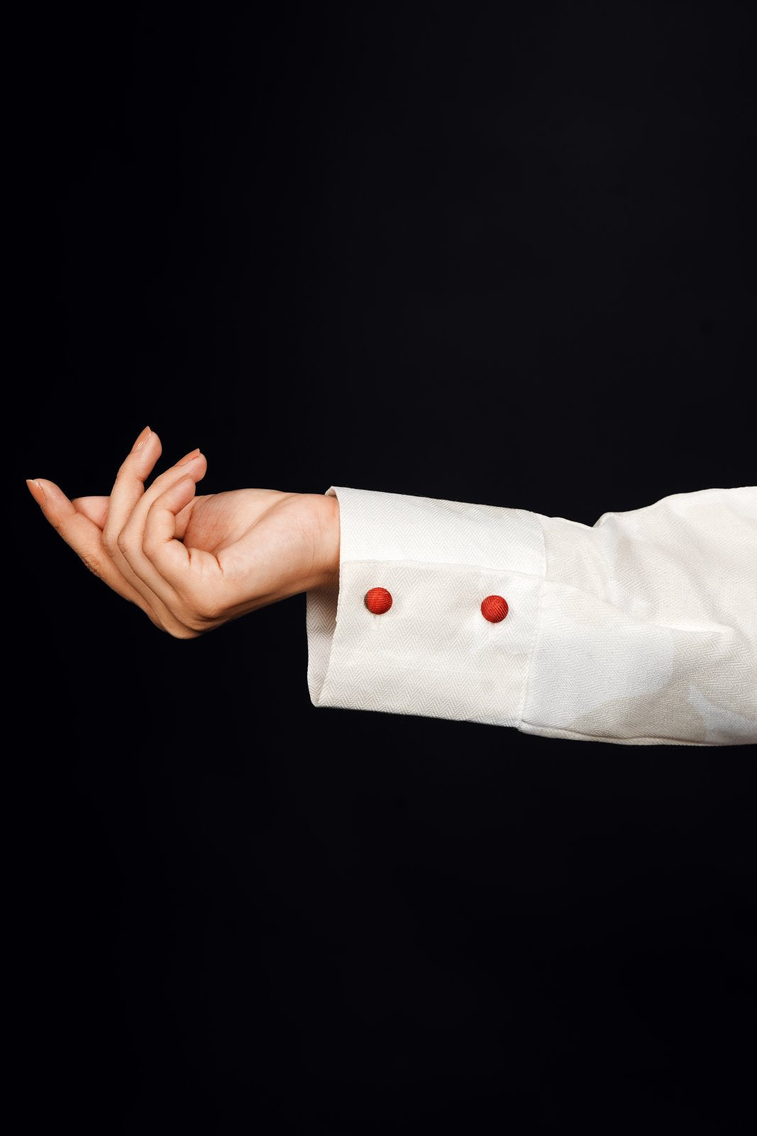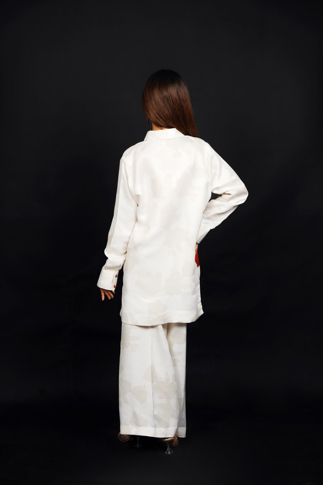 Complementing the shirt, the trousers feature the same Big Red Floral pattern running down the legs, balancing the design between the two pieces. To add depth and texture, a subtle shadowy effect of the same flowers is scattered throughout the entire background of both the shirt and trousers. This creates a soft, tonal floral design beneath the main pattern, as though the flowers are gently fading into the white fabric, giving the outfit a dreamy, layered look.