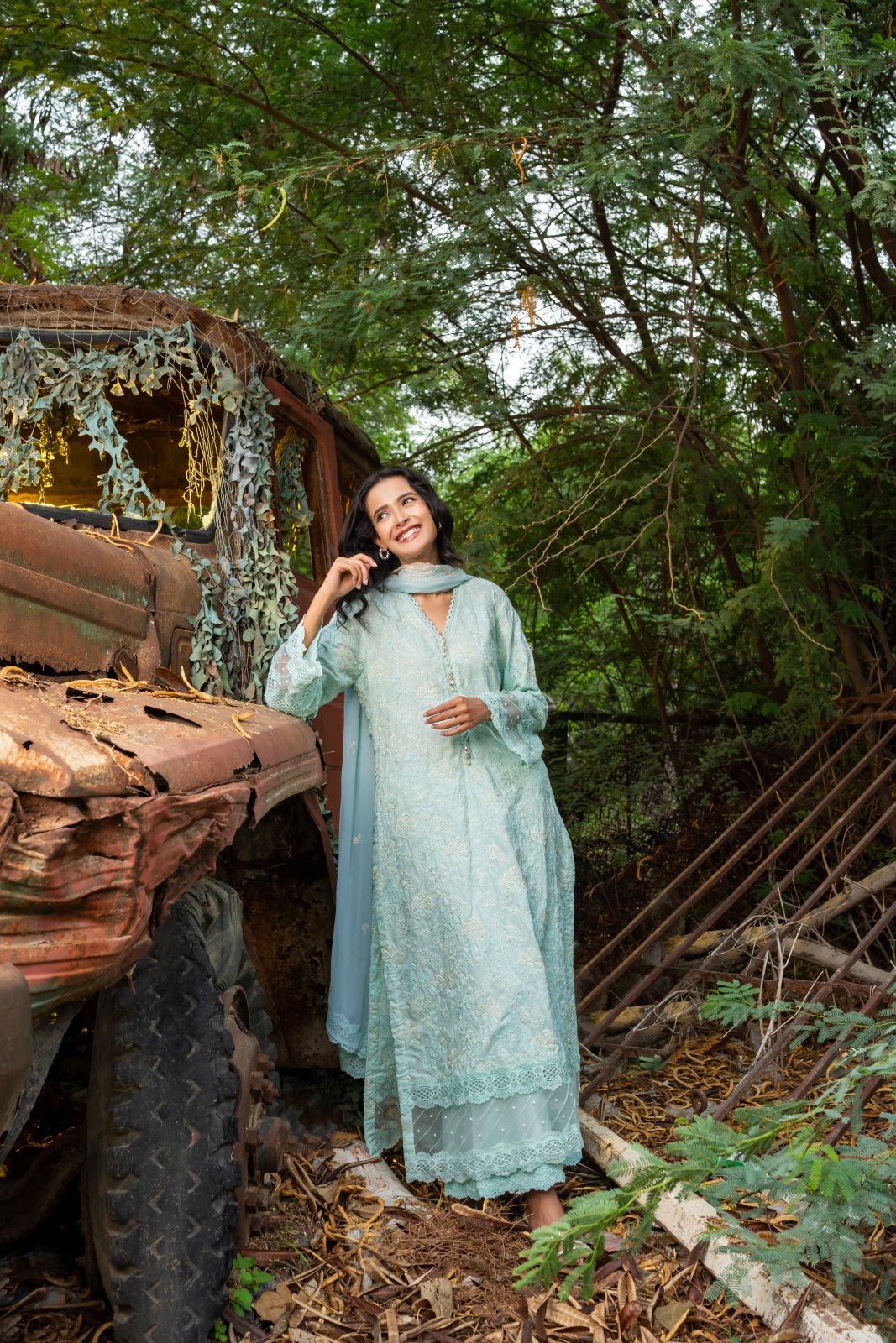 A delicate blue ensemble that exudes grace and sophistication. The ensemble is beautifully embroidered with an all-over floral pattern, featuring a mix of soft and intricate floral designs that add a touch of femininity and charm. The embroidery, done in complementary shades, enhances the ensemble's elegance, making it a perfect choice for any occasion.