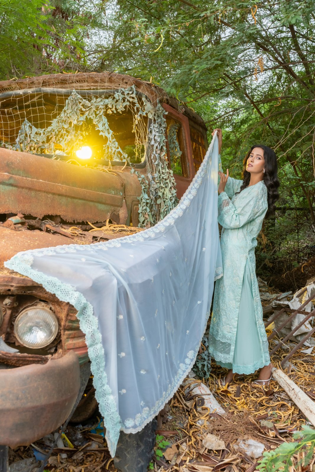 Paired with this exquisite ensemble is an embroidered chiffon dupatta. The dupatta, light and airy, is adorned with matching floral embroidery that echoes the design of the ensemble. The borders of the dupatta are intricately embroidered, with delicate floral motifs scattered across the fabric, creating a seamless and elegant ensemble. The combination of the ensemble and the dupatta makes for a stunning outfit that is both timeless and contemporary.