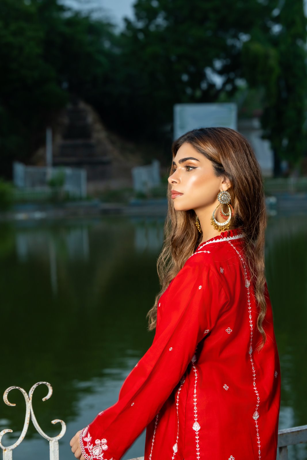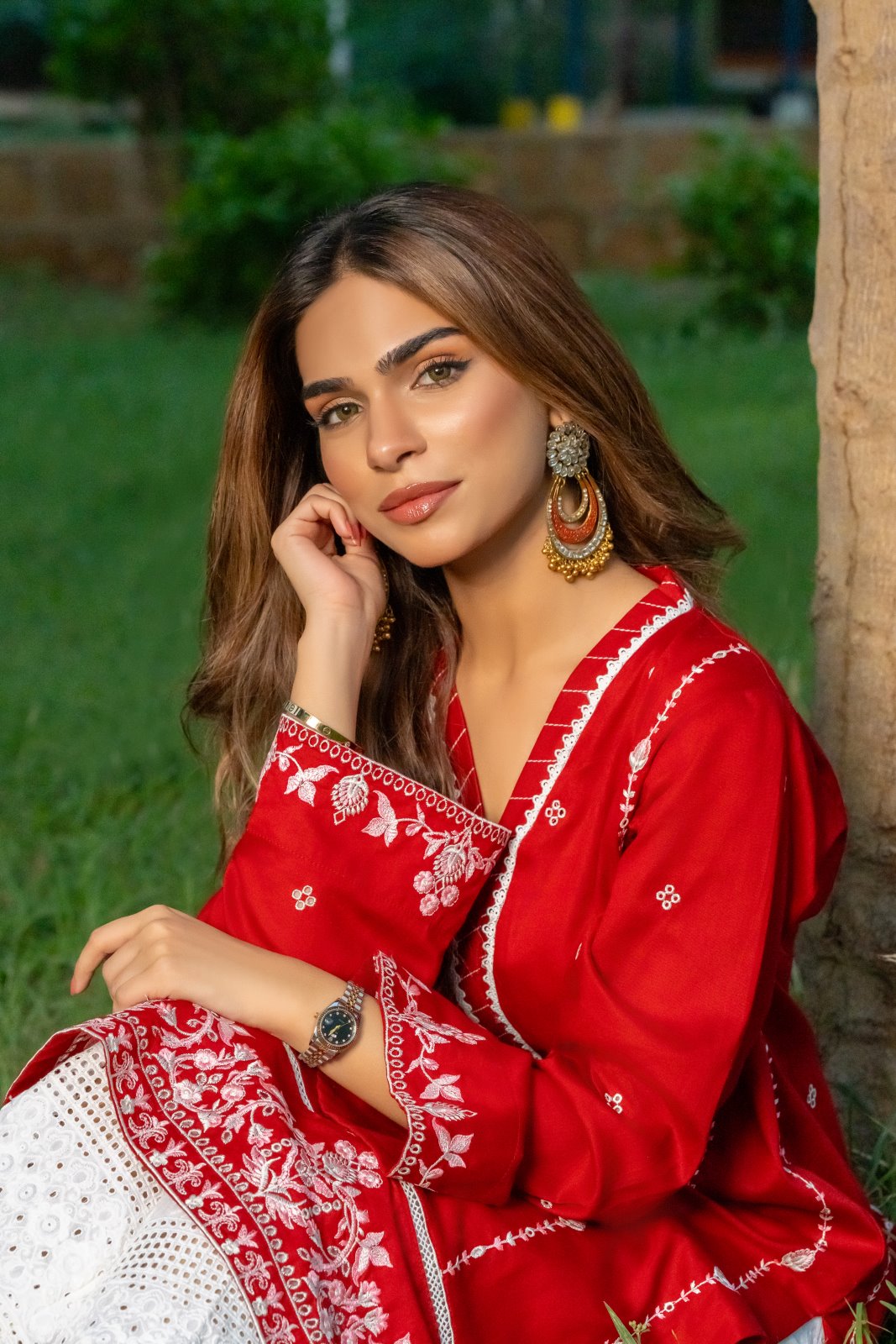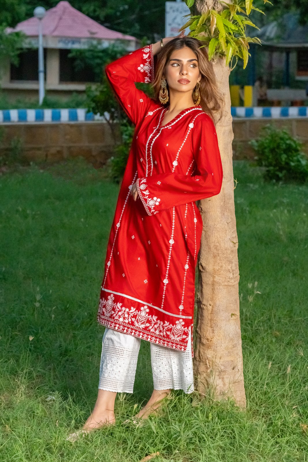 A ready-to-wear shirt in a vibrant, beautiful red color that instantly catches the eye. The fabric is soft and comfortable, designed to drape elegantly on the body while offering ease of movement, during all seasons. The shirt is adorned with intricate Schiffli embroidery in delicate white and light pink threads.